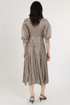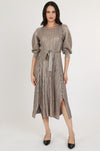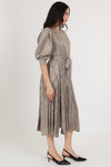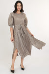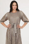 Shine bright in this stunning metallic pleated midi dress. Featuring soft shimmer detailing, voluminous sleeves, and a tie waist for a flattering silhouette, this piece is perfect for holiday parties, date nights, or any occasion that calls for a little sparkle.