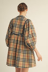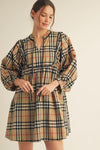 This plaid babydoll dress is the perfect mix of classic and playful. Designed with a relaxed fit and gathered waistline, it drapes beautifully while keeping you comfortable all day. The black velvet bow at the neckline adds a feminine touch, and the billowed sleeves with elastic cuffs give it that effortless boutique feel.