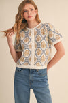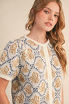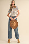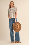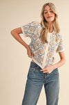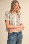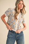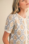 This button front short sleeve sweater features a vintage inspired jacquard pattern in warm caramel and soft blue tones. The cozy textured knit and sweet cropped silhouette make it perfect for pairing with denim, skirts, or layered over a simple tee. A playful yet polished piece you’ll reach for all season long.