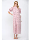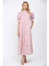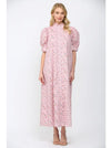 This pink floral midi dress features soft puff sleeves, a high neckline, and a relaxed silhouette for an effortlessly feminine look. Designed with side pockets and lightweight fabric, it is comfortable, flattering, and easy to wear. Perfect for Valentine’s Day and beyond!