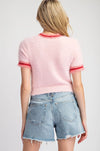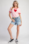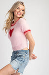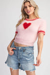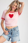This soft, fuzzy knit top features a subtle heart detail for a playful yet elevated look. The short sleeves and cropped silhouette make it easy to style with high-rise denim or layered under a jacket. Sweet enough for Valentine’s Day while remaining wearable well beyond the season, this piece adds a touch of charm to any casual outfit.