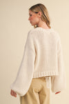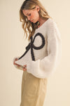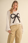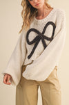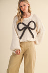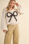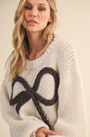 Make a statement in this cozy cream knit sweater featuring an oversized braided bow detail across the front. Designed with a relaxed fit, dropped shoulders, and balloon sleeves for a perfectly slouchy look. Pair it with trousers or denim for a playful, feminine touch to your fall wardrobe.