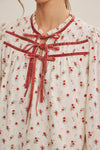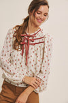 Soft florals meet vintage charm in this romantic blouse featuring dainty red blossoms and velvet ribbon details. The ruffled neckline and double bow ties add a feminine finish, while the billowed sleeves give it that effortlessly graceful drape. Perfect for pairing with denim, trousers, or a fall midi skirt for a timeless, polished look.