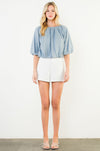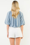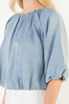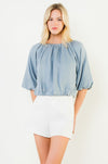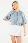 This soft blue blouse features a relaxed, draped silhouette with a gently gathered neckline and airy balloon sleeves. Designed with an elasticized hem for an effortless blouson fit, it’s easy to dress up or down. The lightweight fabric and subtle texture make it a versatile piece for everyday wear, whether paired with tailored shorts, denim, or a skirt.