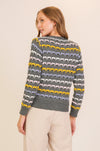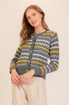 This cozy knit features a soft charcoal base layered with colorful geometric detailing for a modern yet classic look. Finished with pearl-style buttons and ribbed trim, it pairs beautifully with trousers, denim, or layered over a simple tee. A standout piece that brings warmth, texture, and personality to your everyday style.