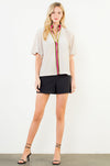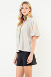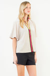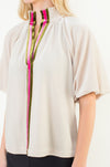A standout piece with subtle sophistication, this blouse features a soft draped silhouette and eye-catching velvet trim in rich olive and vibrant pink. The relaxed fit pairs beautifully with dress pants, denim, or skirts, making it a versatile option for both work and special occasions. Its elevated detailing brings a festive touch for the holiday season while still feeling timeless enough for year-round wear.