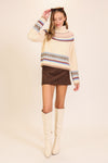 A cozy nod to vintage ski style, this cream turtleneck sweater features colorful fair isle detailing in shades of pink, blue, and brown. Designed with a relaxed silhouette and soft, fuzzy texture, perfect for chilly fall days and mountain getaways alike.
