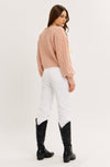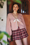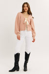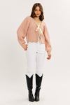Soft, feminine, and oh-so-chic, this cropped cable knit cardigan features a delicate cream ribbon tie closure and balloon sleeves for a cozy yet elevated look. The warm blush hue adds a romantic touch that pairs perfectly with high-rise denim or layered over dresses.