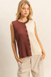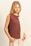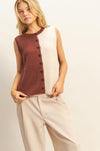 A cozy twist on classic — this sleeveless sweater vest features a two-tone color block design in warm cinnamon and cream, with a contrasting black back panel for an unexpected finish. The soft ribbed knit and button-front detail make it easy to layer over a fitted tee or crisp button-down. Effortless, modern, and made for your fall wardrobe.