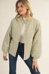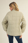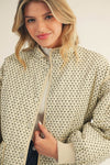This lightweight quilted jacket features an allover subtle floral print in a neutral cream tone. Designed with a snap-button front, relaxed fit, and ribbed cuffs for added comfort and warmth. Front patch pockets add functionality while maintaining a sleek, minimal silhouette. Perfect for layering during the transition into fall and winter.
