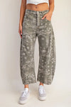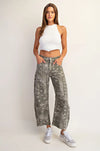 Add a touch of flair with these wide-leg barrel jeans featuring a washed paisley print. The relaxed fit and cropped length make them perfect for casual days or styled-up nights. Finished with a high-rise waist, button closure, and a soft, broken-in denim feel.