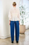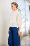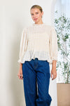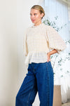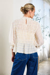 A romantic take on an everyday classic, this blouse features delicate texture, soft ruching, and the prettiest sheer finish. The high ruffled neckline and billowy sleeves give it an effortlessly feminine silhouette that dresses up your favorite denim or layers beautifully under a jacket.