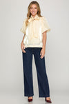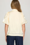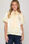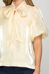 Polished, feminine, and a little bit glam, this blouse catches the light with every move. Featuring puff sleeves and an oversized bow at the neckline, it’s a statement piece that instantly elevates denim, trousers, or a sleek skirt.