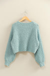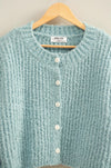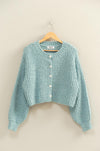 Cozy and effortlessly chic, this textured cardigan is the perfect throw-on-and-go layer. Designed in a soft sky blue, it features a plush waffle-knit texture, cropped length, and a button-up front. Balloon sleeves with ribbed cuffs add a relaxed yet feminine touch, making it easy to dress up with skirts or keep casual with denim.