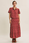 Effortless and feminine, this matching set is designed for easy styling with maximum impact. The puff-sleeve button-front top pairs perfectly with the tiered maxi skirt, both featuring a dainty ivory floral print against a rich rust background. Wear them together for a head-to-toe look