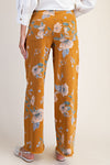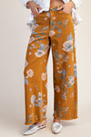 These wide-leg floral pants feature a warm golden base with soft blue and blush blooms throughout. Designed with a relaxed, full-length silhouette, they include functional pockets, a classic zip/button closure, and lightly frayed hems for a lived-in finish. Comfortable with just the right amount of structure.
