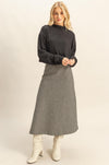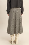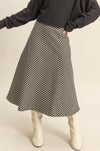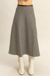 Classic with a modern edge, this houndstooth midi skirt is a timeless piece that elevates any outfit. Designed with a flattering A-line silhouette, it features a structured drape that moves beautifully with every step. The black-and-cream houndstooth pattern adds a chic, vintage-inspired feel, while the faux leather waistband gives it a sleek, updated finish. Perfect for pairing with sweaters, blouses, or boots for a polished look that works from day to night.