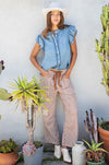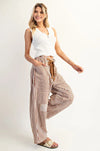 Make a statement with these striped wide-leg pants. Designed with bold vertical stripes in warm brown and cream, they feature oversized patch pockets and a relaxed, straight-leg fit for an effortlessly cool vibe. The drawstring tie waist with grommet detail adds a touch of utility-inspired edge while keeping them comfortable and adjustable. Pair them with sandals, sneakers, or a cropped top for laid-back style with personality.