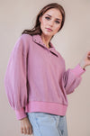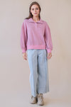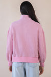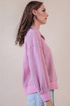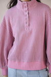 Cozy and playful, this waffle knit pullover adds a pop of color to your everyday wardrobe. Designed in a soft pink hue, it features a mock neckline with button detailing for a sporty-meets-chic look. The relaxed, slightly oversized fit is finished with ribbed cuffs and hem, making it perfect for layering with denim, leggings, or joggers.